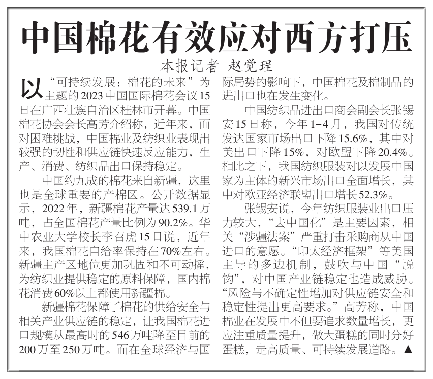 以“可持续发展:棉花的未来”为主题的2023中国国际棉花会议15日在广西壮族自治区桂林市开幕。中国棉花协会会长高芳介绍称,近年来,面对困难挑战,中国棉业及纺织业表现出较强的韧性和供应链快速反应能力,生产、消费、纺织品出口保持稳定。