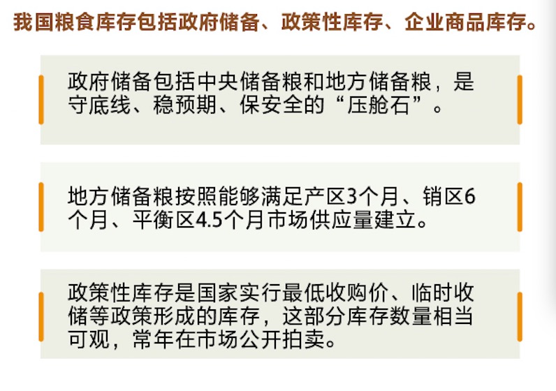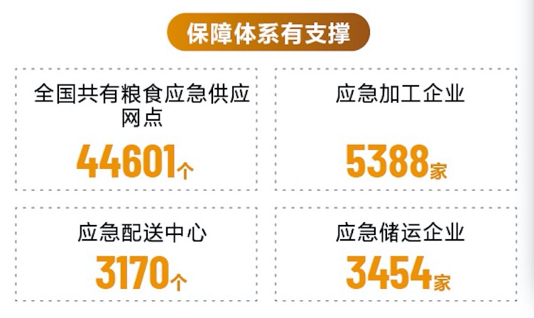 首先,保障体系有支撑,原粮储备、成品粮储备充足,一批应急加工企业、应急供应网点、应急配送中心和应急储运企业已建成;其次,市场波动有监测,我国建立起两级监测体系,国家级粮食市场信息直报点1072个,地方粮食市场信息监测点9206个;第三,应对变化有预案:我国建立了从国家、省、市、县四级的粮食应急预案体系;第四,保供稳市有责任:我国已建立并督促各地严格落实粮食安全省长责任制。